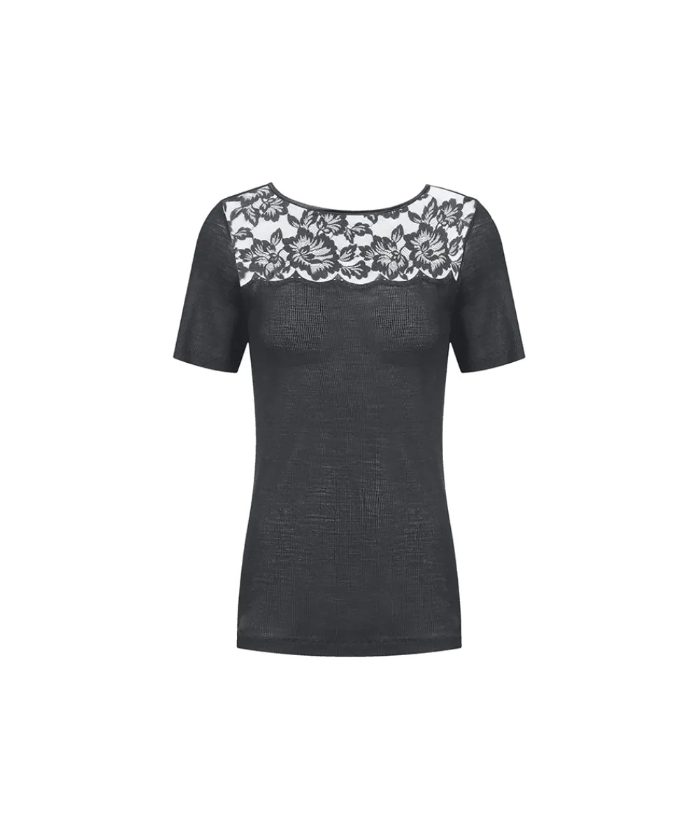 Yndig t-shirt fra Mey i uld med fine blonde detaljer. T-shirten er lavet i uld og silke. Produkter der indeholder en kombination af uld og silke vil den få den egenskab, at det bliver temperatur-regulerende. Det betyder, at det kan varme på kolde dage og køle på varme dage. Materiale: 70 % uld, 30 % silke