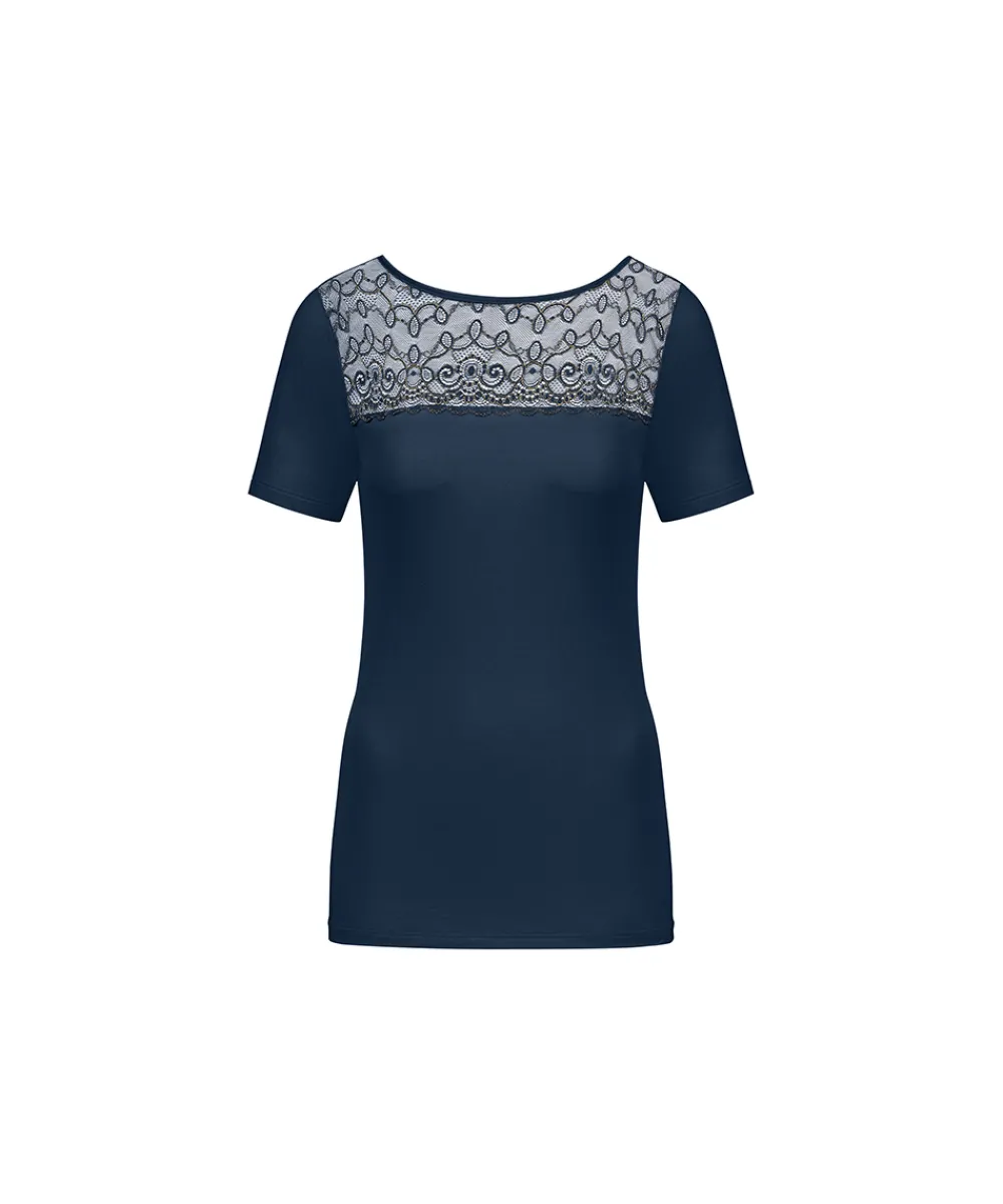 Yndig t-shirt med fine blonde detaljer fra Mey. T-shirten er designet uden generende sidesømme, og lavet i en åndbar kvalitet. Materiale: 50% viskose, 46% polyamid, 4% elastan