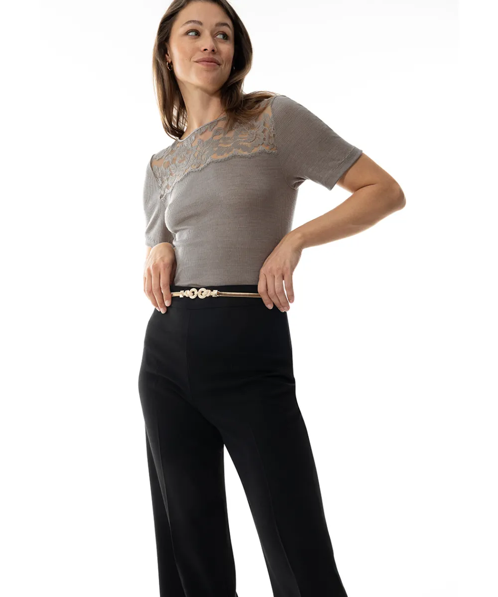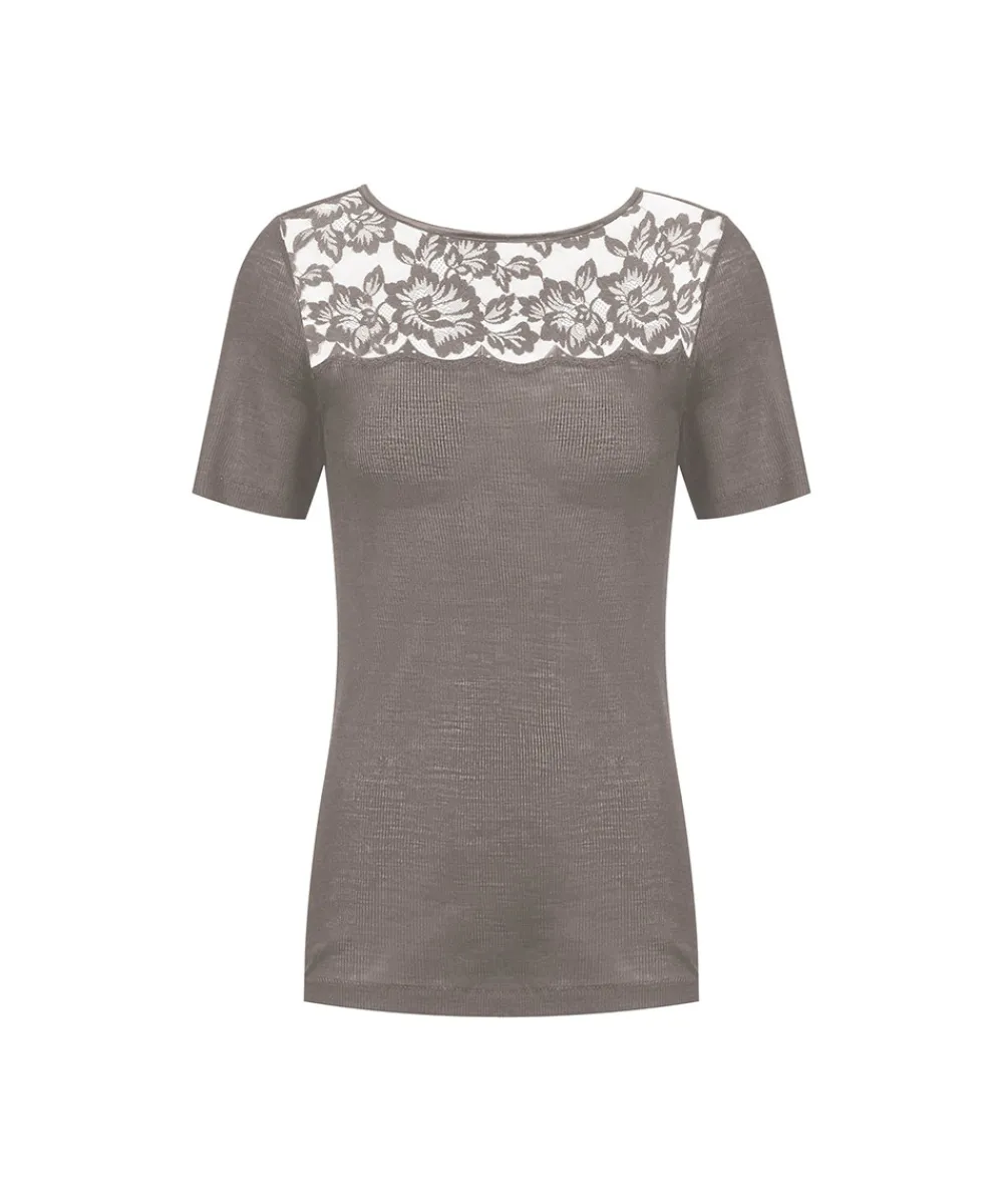 Yndig t-shirt med fine blonde detaljer fra Mey. T-shirten er lavet i uld og silke. Produkter der indeholder en kombination af uld og silke vil den få den egenskab, at det bliver temperatur-regulerende. Det betyder, at det kan varme på kolde dage og køle på varme dage. Materiale: 70 % uld, 30 % silke
