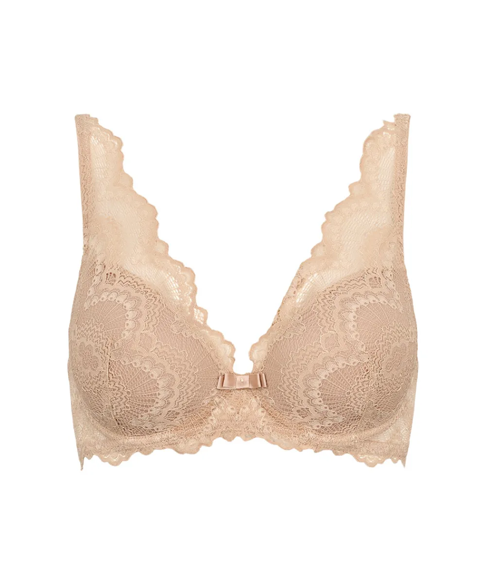 Elegant fuldskålsbh fra Missya med bøjle og formstøbt skål i blonde. Blonden dækker bh’en hele vejen rundt, følger op ad stroppen til skulderen og dækker barmen som en fuldskål, hvilket giver bh’en feminine detaljer samt en god pasform, som er ideel også for en større barm. Materiale: 90% polyamid, 10% elastan.