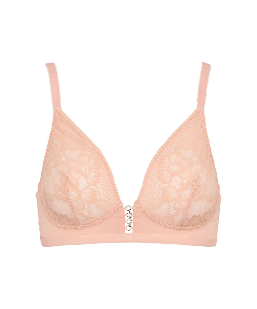 Yndig trekantsbh fra Missya. Bh’en er designet uden vattering og uden bøjle, hvilket giver en fantastisk komfort. Samtidig er den dekoreret med fine blonder. Trekantsbh’er er er skåret skråt og tegner dermed et v-snit for til på barmen. Fordi trekantsbh’en løber skråt over barmen, kan modellen være god til kvinder med mindre fylde øverst på barmen – den skrå linje lukker skålen for oven, så den ikke så let gaber. Materiale: 69% polyamid, 16% polyester, 15% elastan.