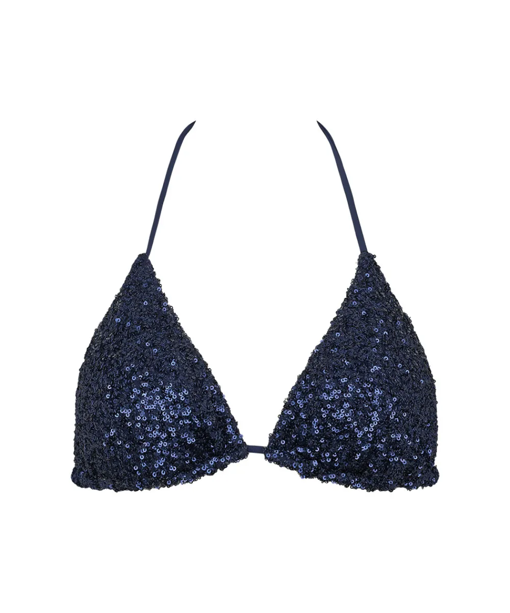 Smart trekantsbikinitop fra Missya med let vatterede skåle. Bikinitoppen er designet med små pailletter. Badetøj skal gerne sidde stramt, da det udvider sig ved brug. Husk altid at skylle badetøjet op i koldt vand efter brug. Materiale: 82% polyester, 18% elastan.