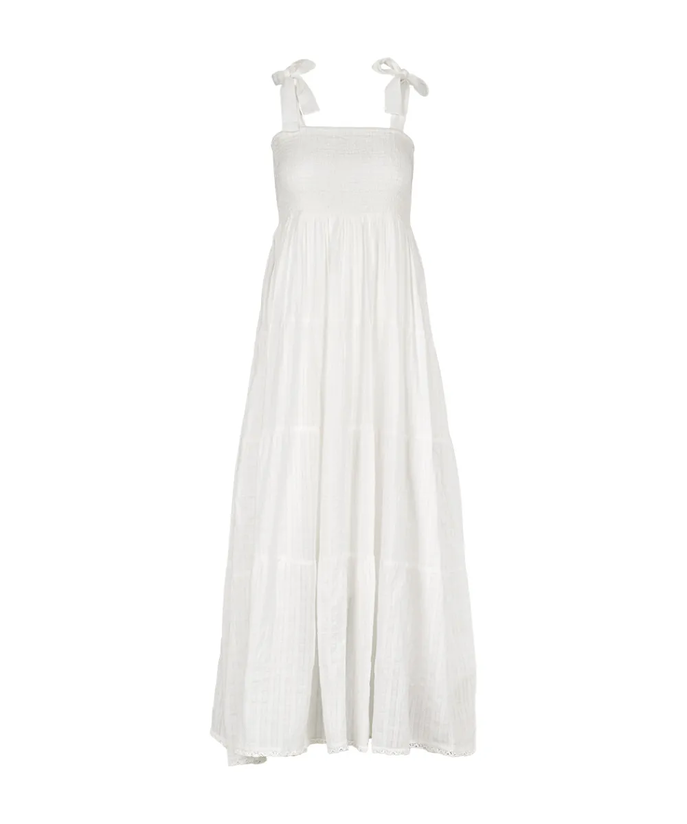 Fin og let strandkjole, som både kan bruges på stranden og som almindelig sommerkjole. Kjolen er lavet af 100% bomuld, så den er dejligt let at have på. Strandkjolen er designet i et rummeligt look. Stropperne har en yndig bindedetalje på skulderen. Materiale: 100% bomuld.