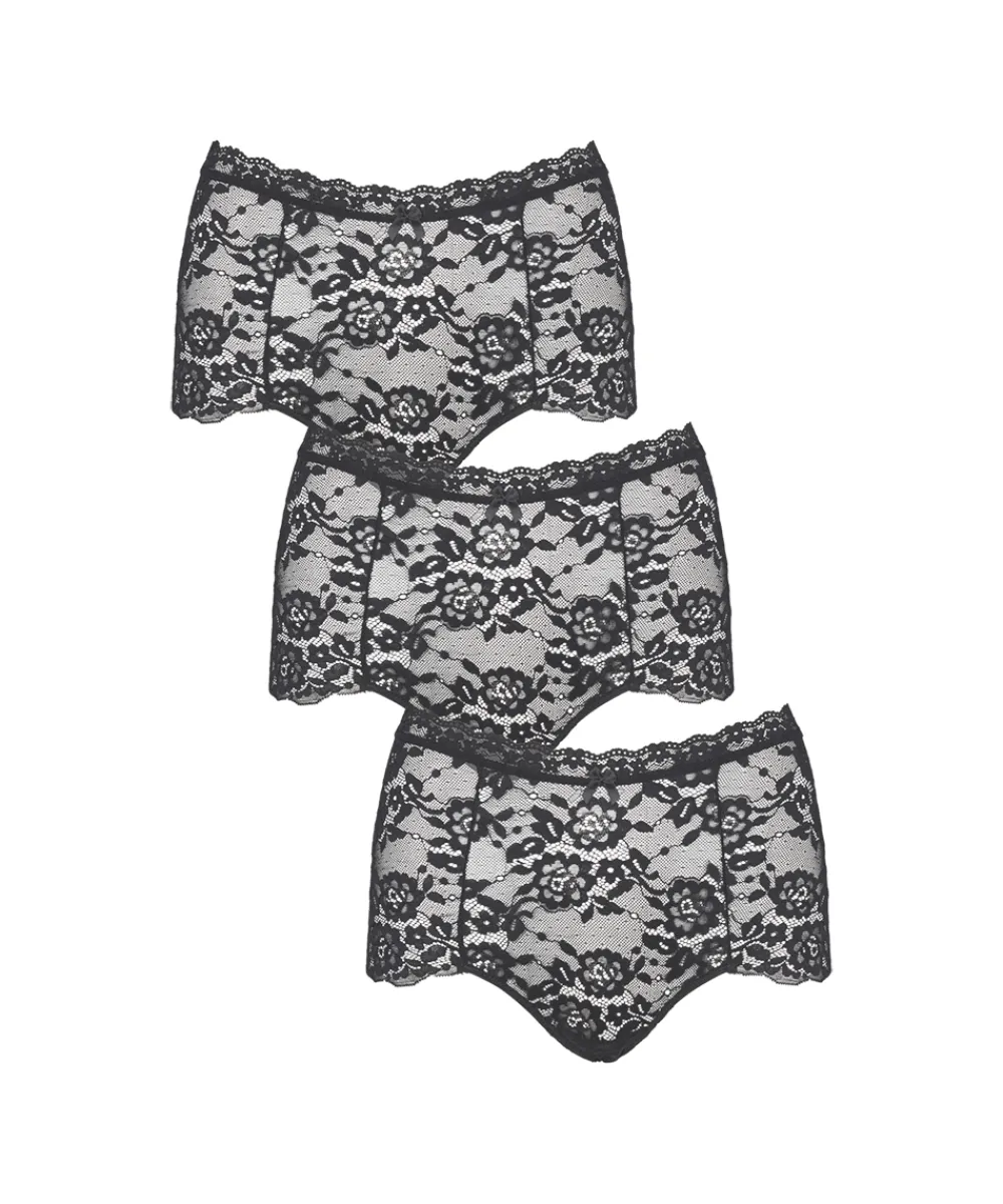 3. paks højtaljet blondetrusser fra Missya. Maxitrussen er en højtaljet trusse med bredt sidestykke og lavt bensnit. Maxitrussen dækker den nederste del af maven og passer derfor godt til tøj, der går op i taljen. Materiale: 85% polyamid, 15% elastan.