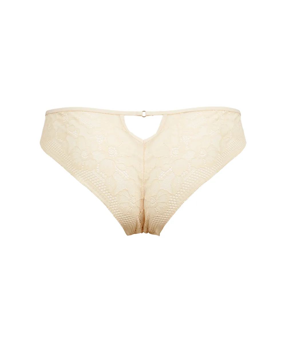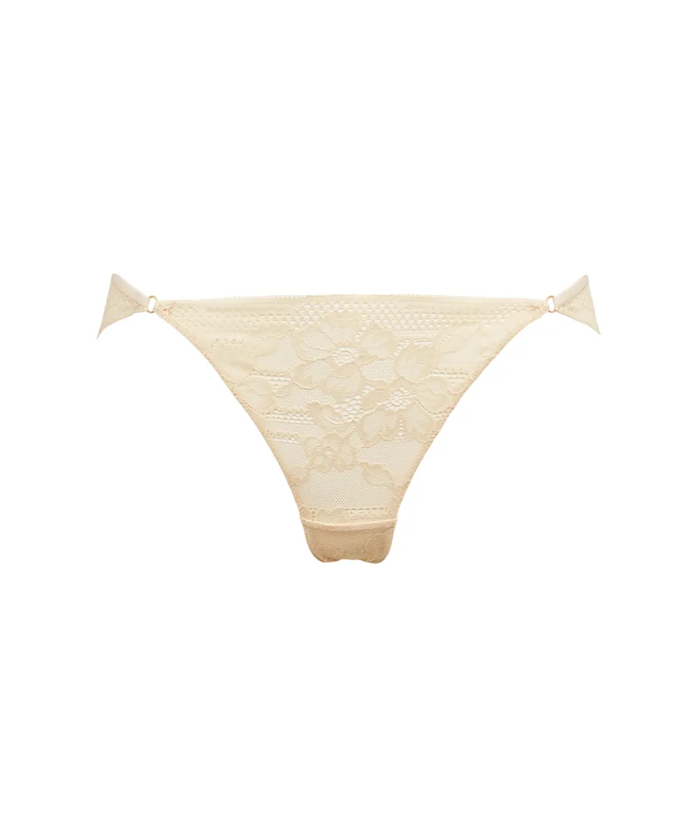 Braziliansk trusse fra Missya. Trussen er designet med et smalt sidestykke, der får benene til at syne længere. Trussen er dekoreret med yndige blonder, og har et flatterende snit. Materiale: 83% polyamid, 12% elastan, 5% bomuld.