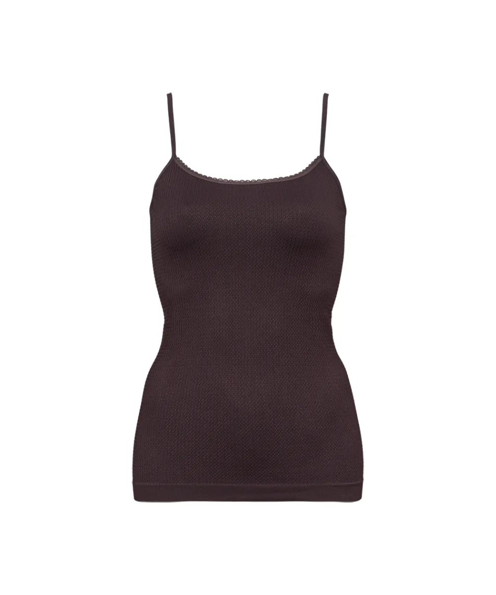 Super blød mikrofiber top med mønster og smalle stropper fra Missya. Lucia Top er den perfekte basis top. Materiale: 93% polyamid, 7% elastan.