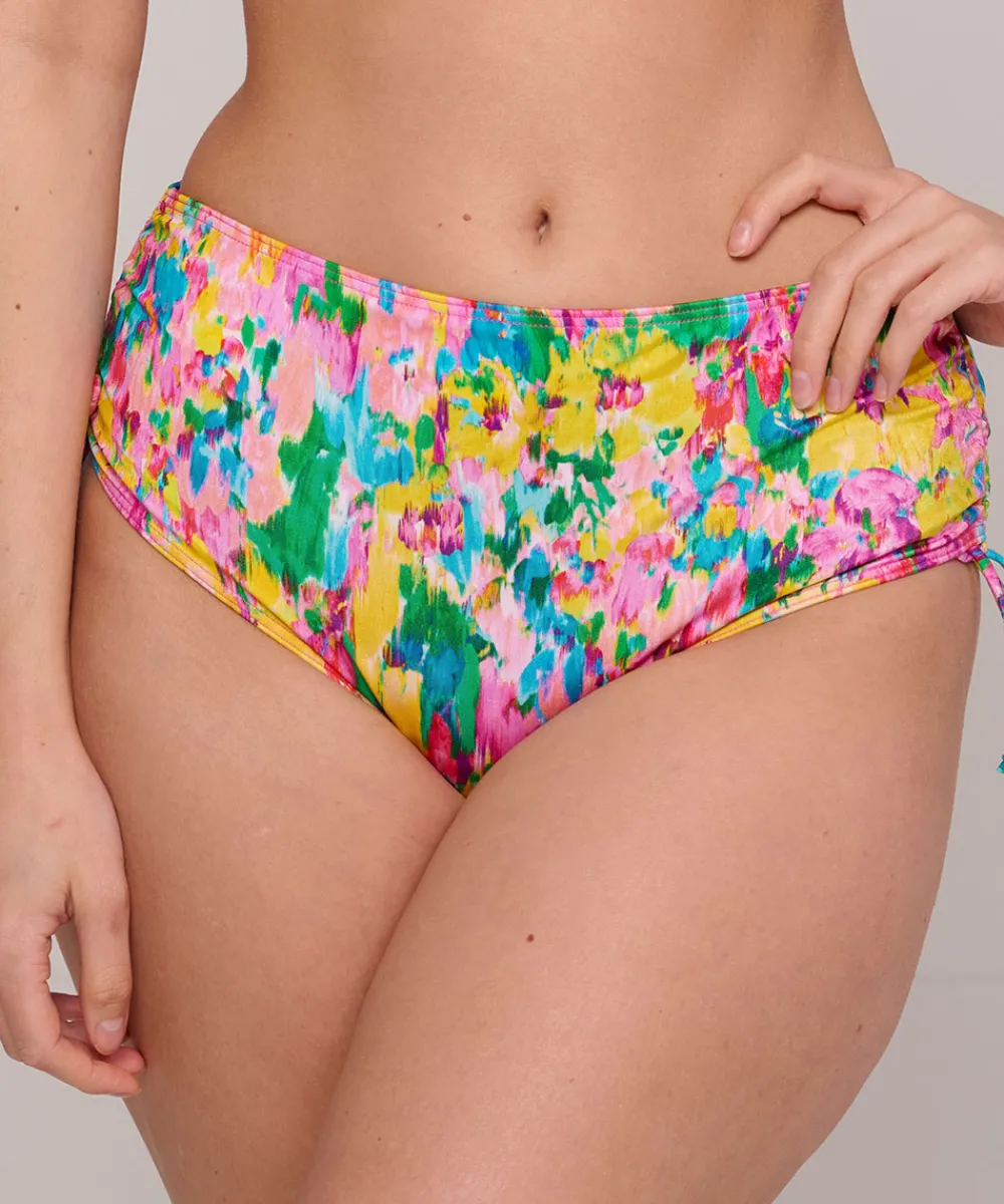 Klassisk højtaljet bikiniunderdel fra PrimaDonna i farverigt print. Bikini trussen er designet med snore i siden, der k…