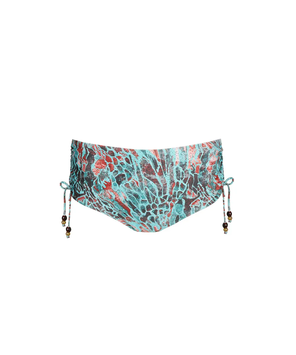 Elegant og høj bikinitrusse fra PrimaDonna i farverigt print, hvor taljehøjden kan justeres i sidestykkerne. Badetøj skal gerne sidde stramt, da det udvider sig ved brug. Husk altid at skylle badetøjet op i koldt vand efter brug. Materiale: 82% polyester 18% elastan