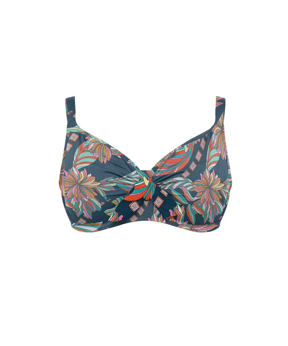 Fin bikinitop med en dekorativ knude. Bikinioverdelen er uden vattering og med bøjle. Badetøj skal gerne sidde stramt, da det udvider sig ved brug. Husk altid at skylle badetøjet op i koldt vand efter brug. Materiale: 92% polyamid, 8 % elastan.