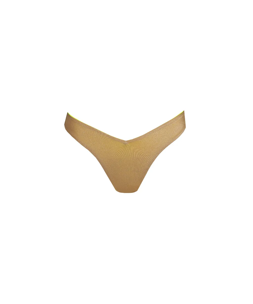 Stilfuld bikinitrusse fra Sarda, som er vendbar så du kan mix & match. Vær modig med fluorescerende gul eller omfavn den gyldne side med en tanned farve med let glimmer, perfekt til alt fra solopgangs paddle eller surfing til solnedgangscocktails. Bikiniunderdelen er designet i en brazilian model, som er mindre dækkende end en taitrusse. Badetøj skal gerne sidde stramt, da det udvider sig ved brug. Husk altid at skylle badetøjet op i koldt vand efter brug. Materiale: 40% polyamid 31% polyester 19% metaliske fibre 10% elastan