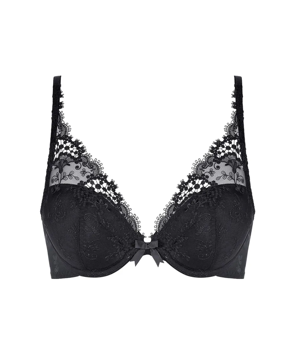 Trekantet push-up bh, der centrerer, samler og løfter barmen. Push-up effekten kan nedtones med udtagelige puder. Bh’en er dekoreret i de fineste guipure broderier, hvor hvert enkelt broderi bliver omhyggeligt bearbejdet. Bh’en er ideel under lavt skåret bluser og kjoler.