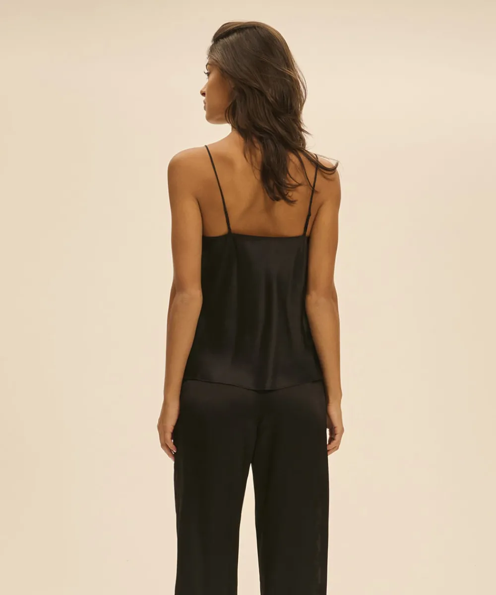 Yndig camisole fra Simone Pérèle med flatterende V-hals udskæring. Camisolen er lavet i 100% vævet silkesatin. Silke er temperatur-regulerende, hvilket betyder at silke varmer på kolde dage og køler på varme dage. Så du kan med fordel købe nattøj eller homewear i naturlig silke, da du kan iføre dig det året rundt. Materiale: 100% silke.
