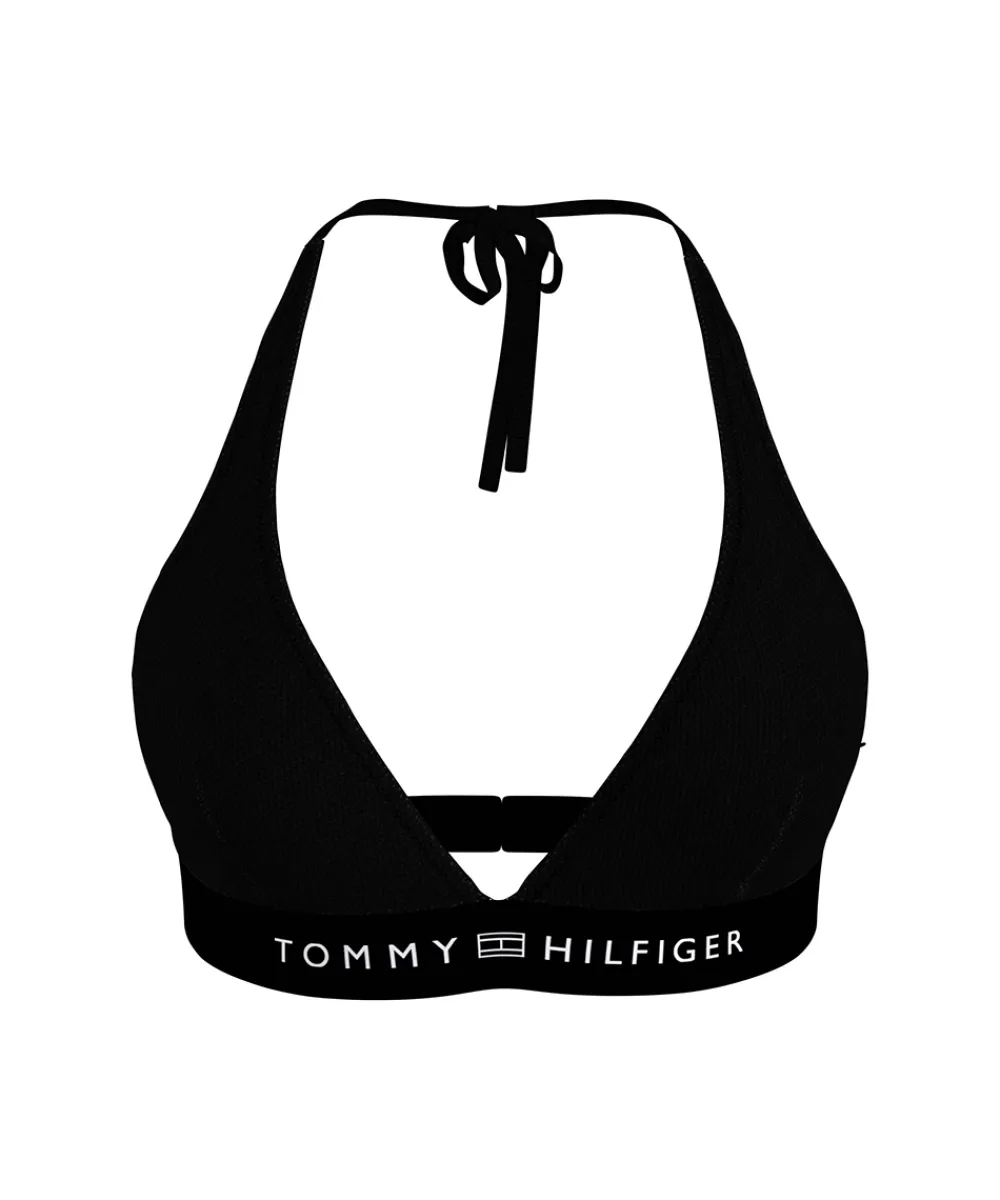 Tommy Hilfiger bikinitop med bindebånd i nakken. Badetøj skal gerne sidde stramt, da det udvider sig ved brug. Husk altid at skylle badetøjet op i koldt vand efter brug. Materiale: genanvendt nylon / polyamid 94%, elastan 6%