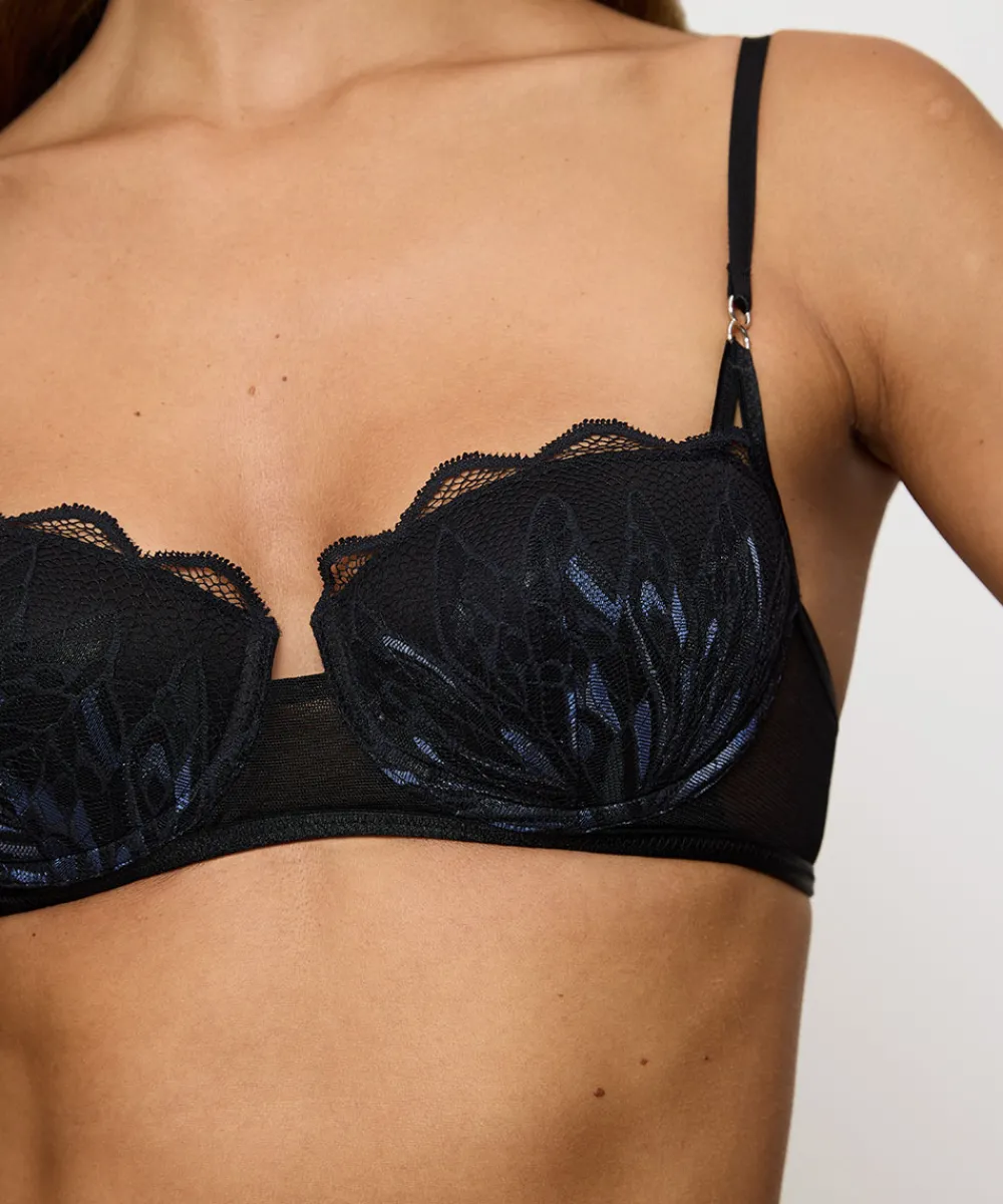 Elegant halvskålsbh fra Triumph med smukke blonder på skålene. Bh’en er designet med en forførende udskæring, som bidrager til en løftende og samlende effekt. Halvskålsbh’er kaldes ofte balconetter. Balconette bh’er har et vandret snit på skålene og dækker halvdelen af barmen. Stropperne er placeret yderst ude på skuldrene, og balconettebh’en er derfor perfekt til toppe med dybe/ vide udskæringer. Materiale: 44% polyamid, 43% polyester, 10% elastan, 3% viskose
