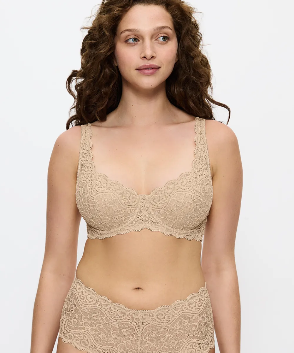 Let polstret trekvartskålsbh fra Triumph med bøjle i fin blomsterblonde og elegant picotkant i udskæringen og på stropperne fra Triumphs Amourette serie. Skålene er betrukket med fin tylblonde – i LYCRA®-kvalitet, der tilpasser sig perfekt til kroppens former og giver maksimal bevægelsesfrihed. Balconette bh’en har glat mikrofiber i siderne og elastisk materiale indvendigt ved skålkanterne. Bh’en har elegante og glatte syninger for ultimativ komfort. Materiale: 51% polyamid, 22% elastan, 16% bomuld, 11% polyester