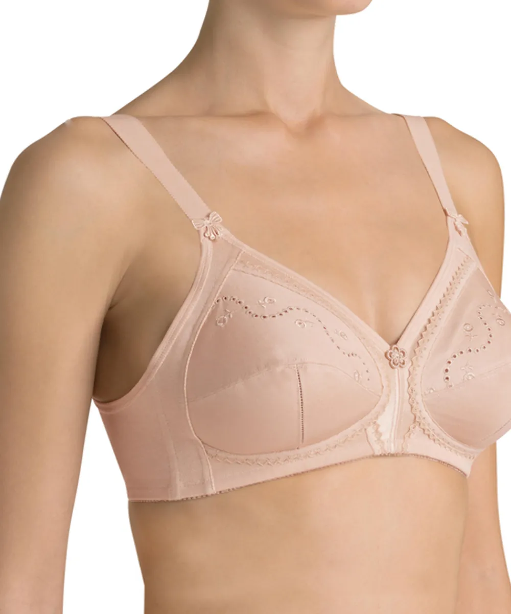 Enkelt og elegant bøjlefri fuldskålsbh, som er designet i blød bomuld. Bh’en har optimal bærekomfort og fantastisk hold. Modellen er også god til kvinder med en større barm. Bh’en har nikkelfri og polstret hægtelukning.