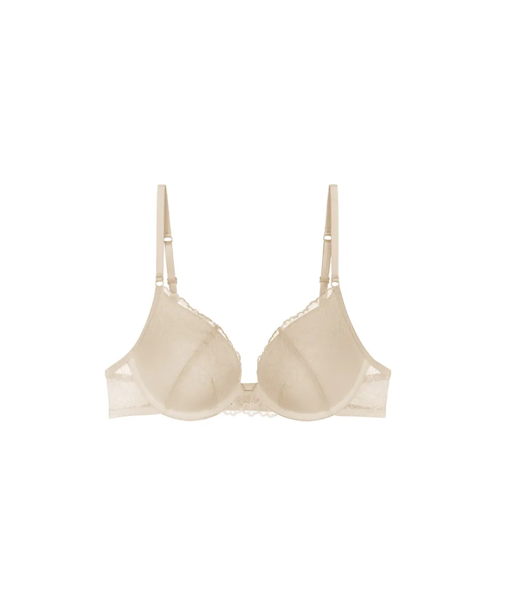 Smuk push up bh fra Triumph, designet i den fineste blonde. En push-up bh samler og løfter barmen ved hjælp af indlæg/ fyld. Vælg push-up modellen, hvis du gerne vil fremhæve din barm og skabe en synlig kavalergang. De fleste push-up bh’er fås i trekvartskål med skrå udskæring og push halvt fra siden og halvt fra bunden. Materiale: 56% polyester, 34% polyamid, 10% elastan