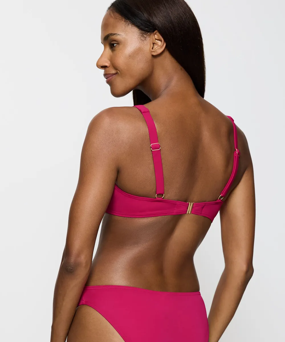 Smuk bikinioverdel med feminin kavalergang fra Triumph. Bikinitoppen er fremstillet af genanvendt materiale og har justerbare stropper samt en knude i midten. Bikinitoppen giver god støtte med power-mesh i større skålstørrelser, så det er den perfekte pasform. Badetøj skal gerne sidde stramt, da det udvider sig ved brug. Husk altid at skylle badetøjet op i koldt vand efter brug. Materiale: 77% polyamid, 23% elastan