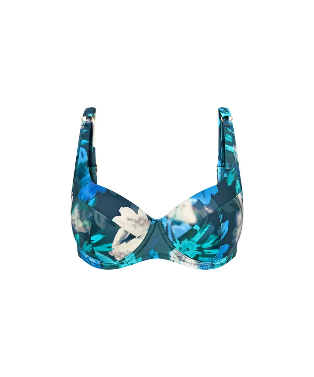 Klassisk bikinioverdel med bøjle fra Triumph. Bikinitoppen er designet med indi et yndigt sommerprint. Sæt bikinioverdelen sammen med bikinitrusser fra badetøjsserier fra Triumph. Badetøj skal gerne sidde stramt, da det udvider sig ved brug. Husk altid at skylle badetøjet op i koldt vand efter brug. Materiale: 77% polyamid, 23% elastan