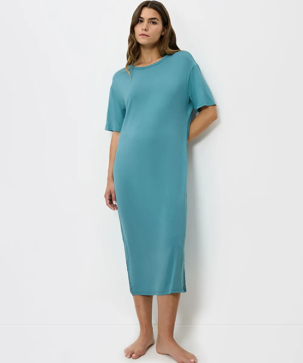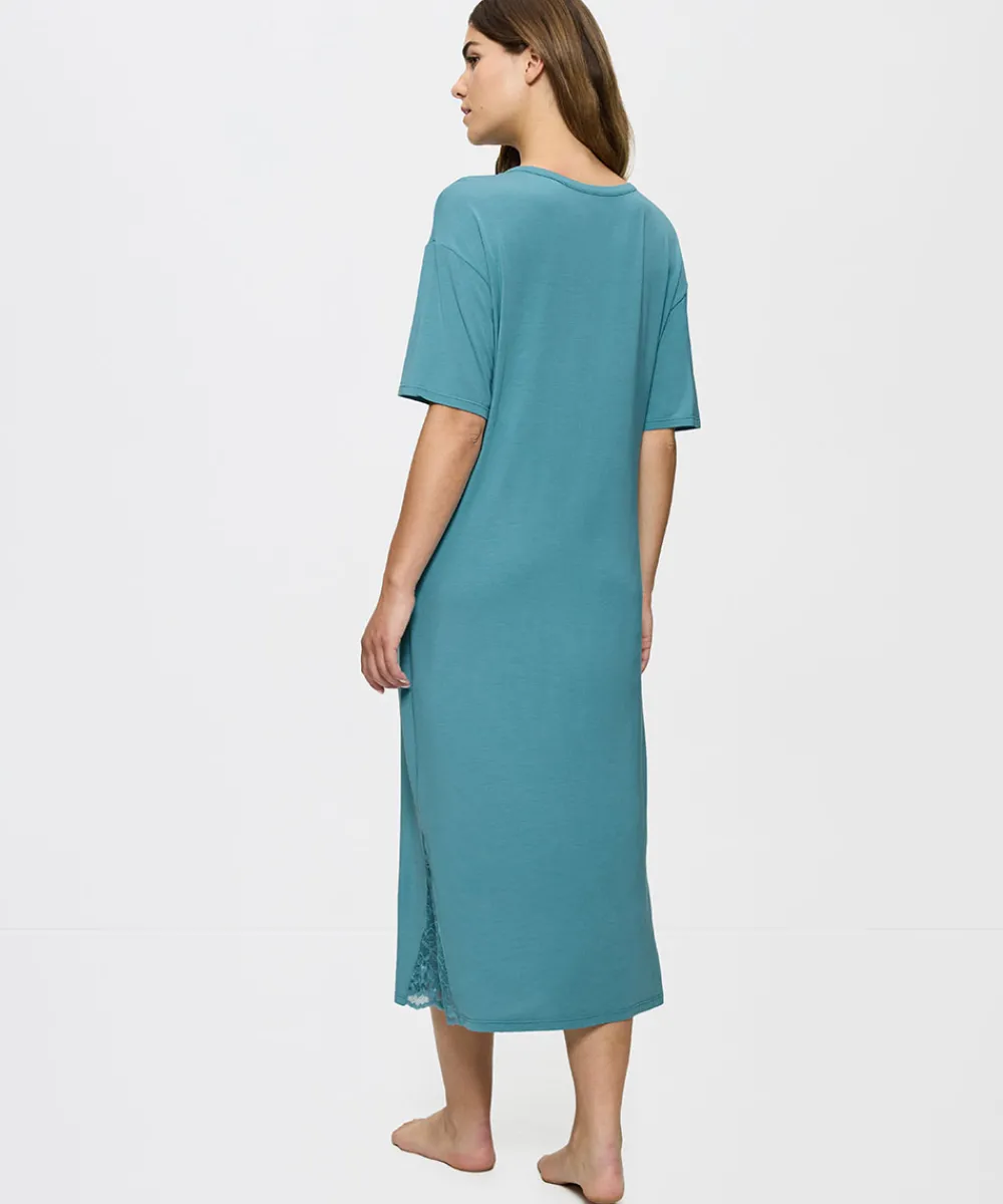 Skøn natkjole fra Triumph, som er fremstillet af 94% certificeret TENCEL ™ Modal. Natkjolen er designet med korte ærmer og knælængde. Det bløde, elastiske materiale falder smukt og er let at vedligeholde. Tøj lavet i modal er fordelagtig at have, hvis du ønsker åndbart og hurtigtørrende tøj. Dertil kan modal have en kølende effekt, og samtidig er det meget vandabsorberende – hvilket kan være til gavn for dig, hvis du har tildens til at svede. Materiale: 94% modal, 6% elastan