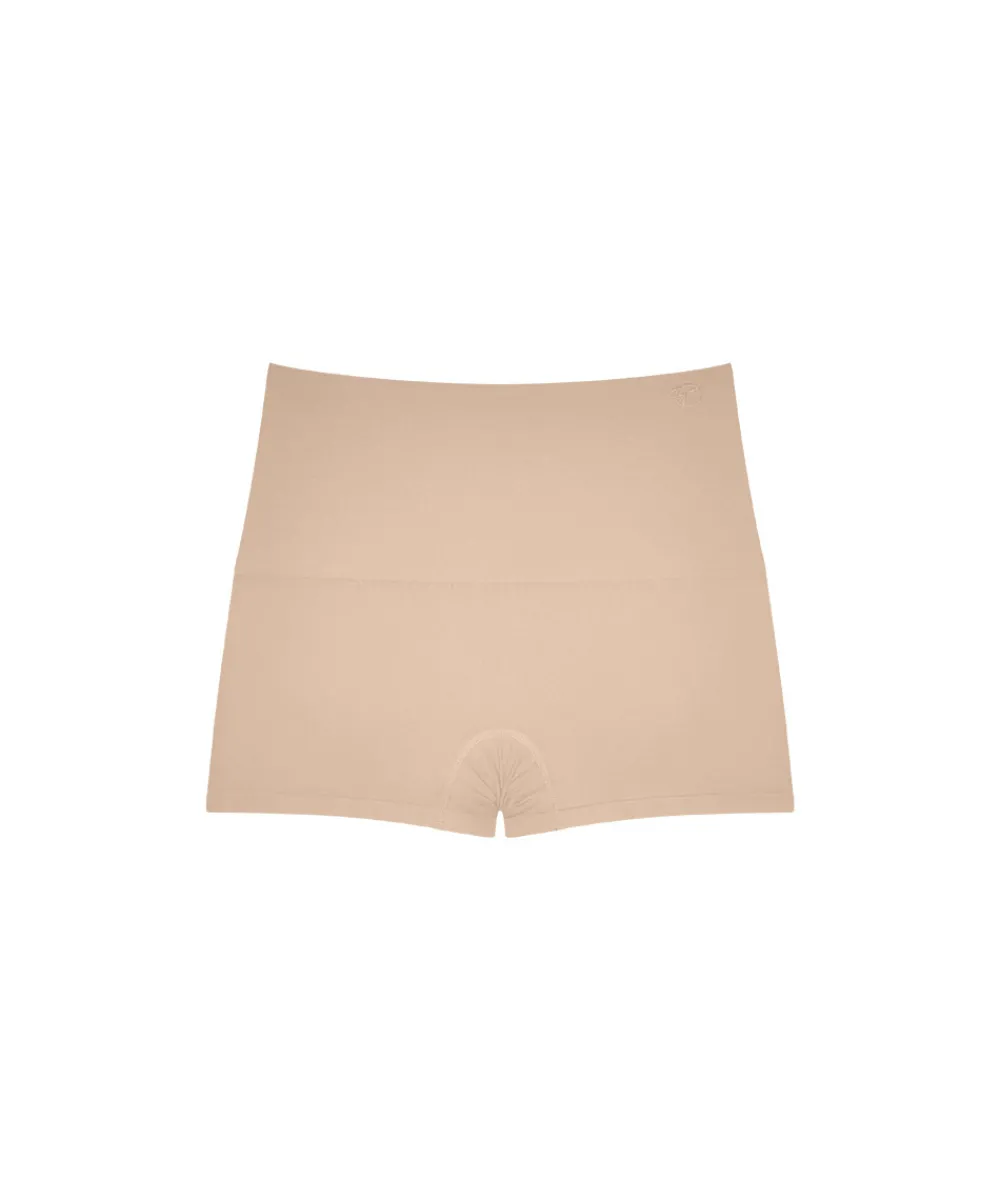 Shapewear shorts fra Triumph med korte ben. De sømløse og glatte bandeau shorts trussen giver maksimal dækning og usynlige kanter, og er delvist fremstillet af genanvendt polyamid. Den sømløse strikketeknik giver både komfort og en moderat støtte på maven. Materiale: 78% polyamid, 22% elastan