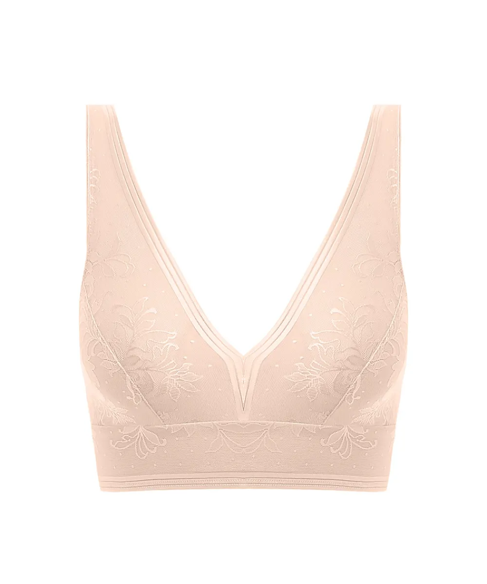 Skøn mesh trekantstop uden bøjle og uden vattering fra Wacoal. Trekantsbh’en er designet med v-formet skåle i smuk mesh med broderinger, som lægger sig pænt til barmen. Braletten er designet med et bånd under skålene, for at give lidt støtte. Materiale: 55% polyamid, 25% elastan, 20% polyester.