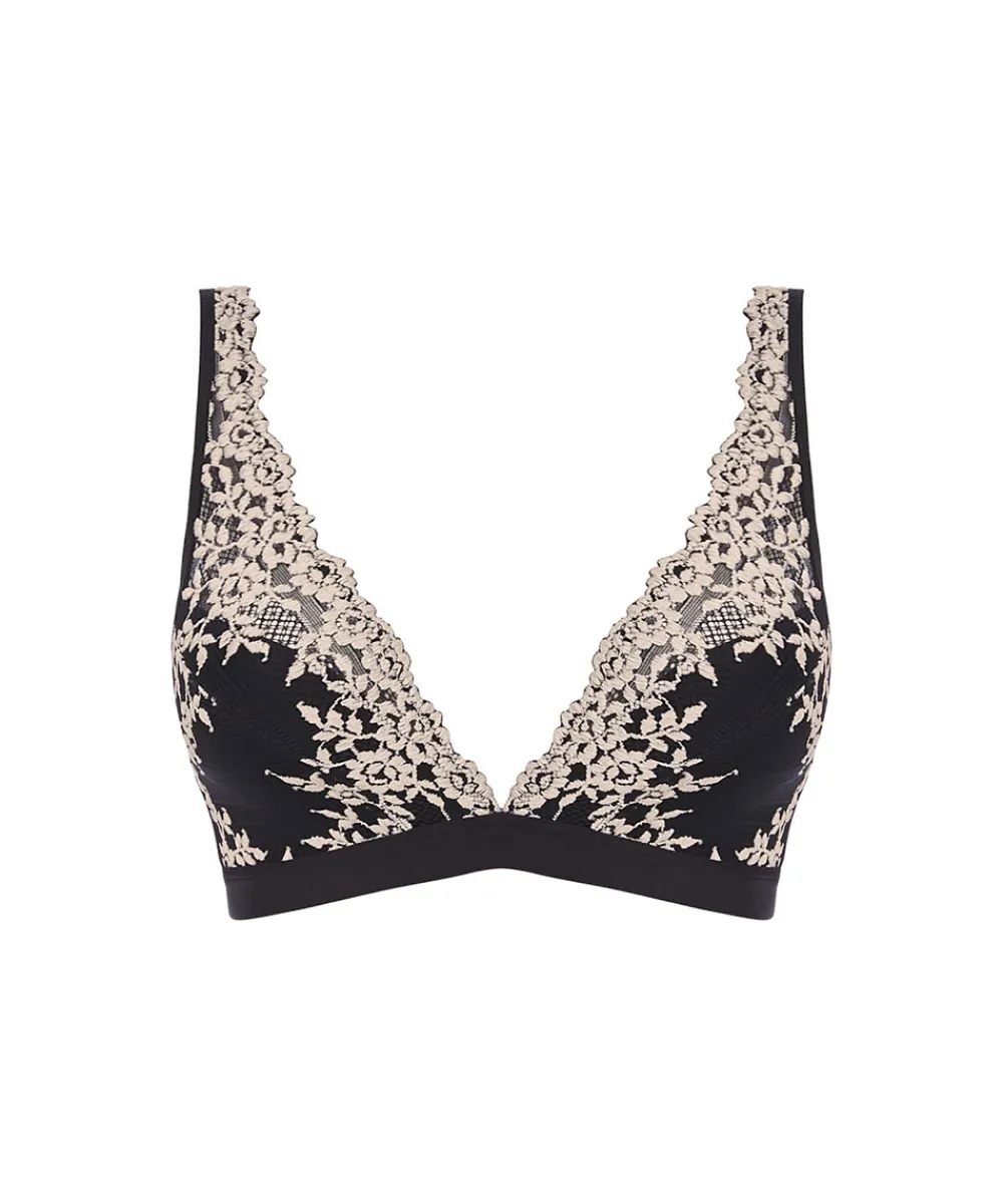 Skøn blonde trekantstop uden bøjle og uden vattering fra Wacoal. Trekantsbh’en er designet med v-formet skåle med en smuk blonde, som lægger sig pænt til barmen. Toppen er designet med et bredt bånd under skålene, for at give en god støtte. Bh’ens stropperne er justerbare og kan derfor krydses på ryggen. Materiale: 91% polyamid, 9% elastan