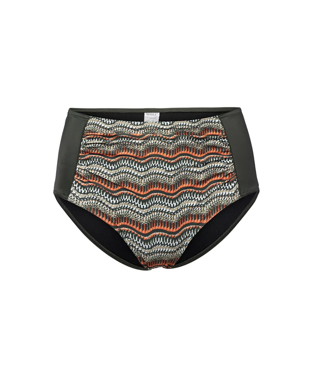 Bikiniunderdel fra Wiki, som er lavet i en klassisk taimodel med høj talje. Komfortabel og bred linning, som er designet med dekorative rynkedetaljer. Badetøj skal gerne sidde stramt, da det udvider sig ved brug. Husk altid at skylle badetøjet op i koldt vand efter brug. Materiale: 82% nylon, 18% HighClo elastan.