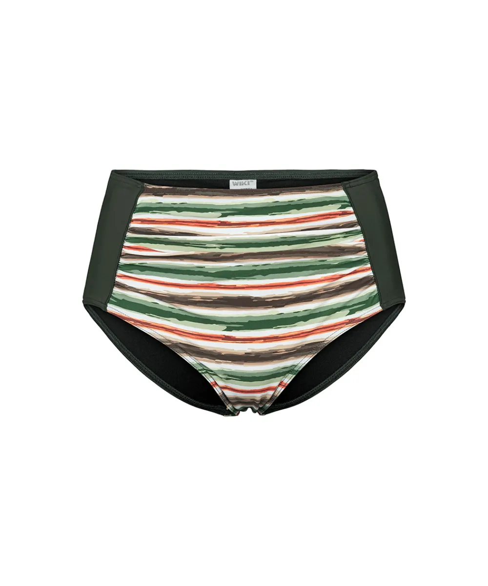 Bikiniunderdel fra Wiki, som er lavet i en klassisk taimodel med høj talje. Komfortabel og bred linning, som er designet med dekorative rynkedetaljer. Badetøj skal gerne sidde stramt, da det udvider sig ved brug. Husk altid at skylle badetøjet op i koldt vand efter brug. Materiale: 82% nylon, 18% HighClo elastan.