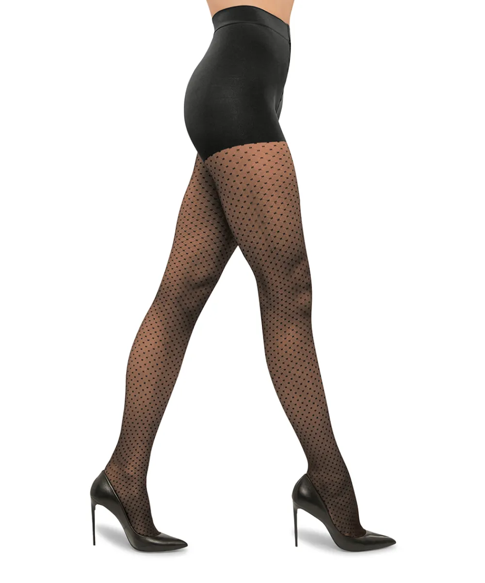 Smukke strømpebukser fra Wolford med shape-effekt. Strømpebukserne er lavet i rundstrik og prydset med et tidsløst mønster med et geonmetrisk rombedesign og prikker. Strømpebukserne er strikket i rundstrik og med en bred, blød linning, der sikrer komfort og en god pasform. Strømperne er 20 denier. Materiale: 81% polyamid, 17% elastan, 2% polyester.